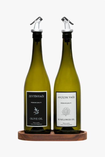 Set İçeriği: 2 adet cam yağdanlık + 1 adet ahşap stand