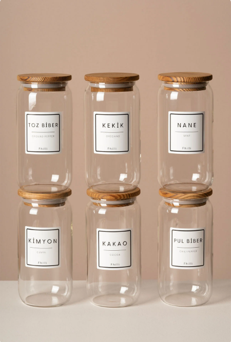 6 adet cam kavanoz, baharat, çay, kahve, şeker, kuruyemiş veya toz gıdaları saklamak için idealdir.