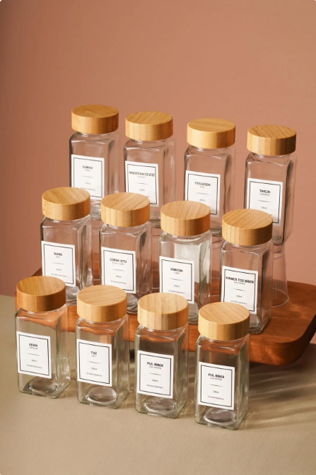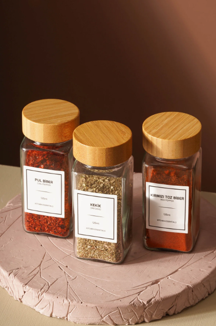 Her biri 125 ml hacmindeki şeffaf cam kavanozlar, baharatlarınızı taze ve aromatik tutarken, bambu kapaklar hava geçirmez özelliğiyle maksimum koruma sağlar. Sete dahil olan etiket hediyesi, mutfakta profesyonel bir düzen oluşturmanıza yardımcı olur.
