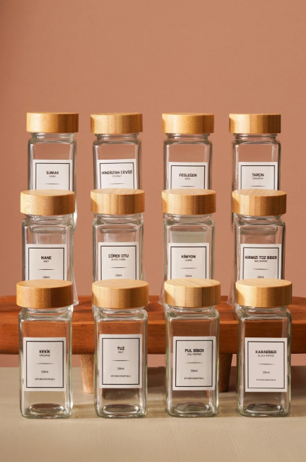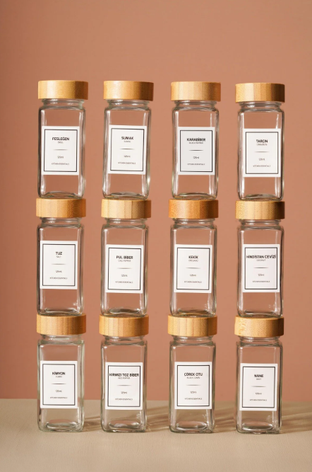 Set İçeriği: 12 adet cam kare baharat kavanozu + 12 adet etiket (hediye)