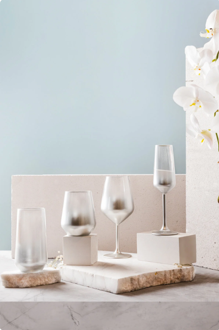 Glow Serisi, zarafeti modern çizgilerle buluşturan tasarımıyla her sofraya ışıltı katar. Gümüş detaylarıyla minimal ama etkileyici bir görünüm sunar. Hem günlük sofralar hem de özel davetler için mükemmel bir tamamlayıcıdır.