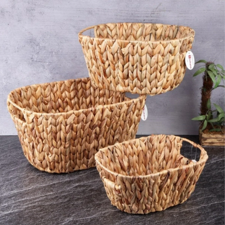 Küçük, orta ve büyük boylardan oluşan bu 3’lü set; banyo, mutfak, yatak odası veya salon gibi her alanda eşyalarınızı düzenlemenize yardımcı olur. Dayanıklı yapısı sayesinde uzun süre ilk günkü formunu korur ve ortamınıza sıcak, doğal bir atmosfer kazandırır.