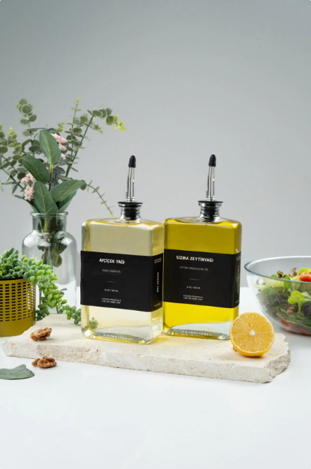 Her biri 500 ml kapasiteye sahip iki cam şişe, sıvı yağ ve zeytinyağınızı şık bir şekilde saklamanızı sağlar.